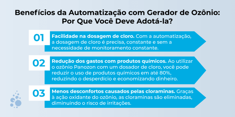 Os geradores de ozônio não apenas automatizam o processo de tratamento de água, como também apresentam uma série de benefícios. O principal deles é a redução da presença de cloraminas. Como resultado, temos uma piscina sem aquele cheiro característico do “cloro” e com menor risco de causar irritações na pele e nos olhos dos banhistas.